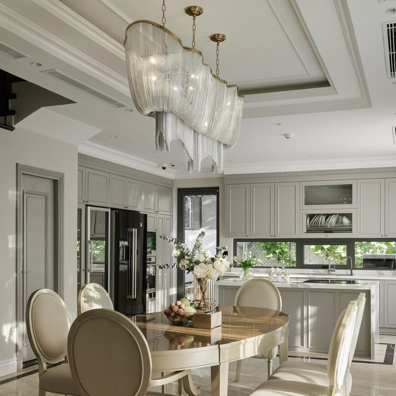 Khu vực bếp tượng trưng cho Hỏa khí, trong khi phòng ăn là nơi sum họp gia đình. Ánh sáng ở đây nên ấm áp, mang lại cảm giác quây quần và gần gũi. Không nên để ánh sáng chiếu trực tiếp vào bếp nấu để tránh Hỏa khí tăng cao, gây xung khắc với các yếu tố khác. Đèn thả trang trí phía trên bàn ăn là lựa chọn lý tưởng, vừa định hình không gian, vừa tăng tính thẩm mỹ và hỗ trợ dòng khí lưu thông nhẹ nhàng.