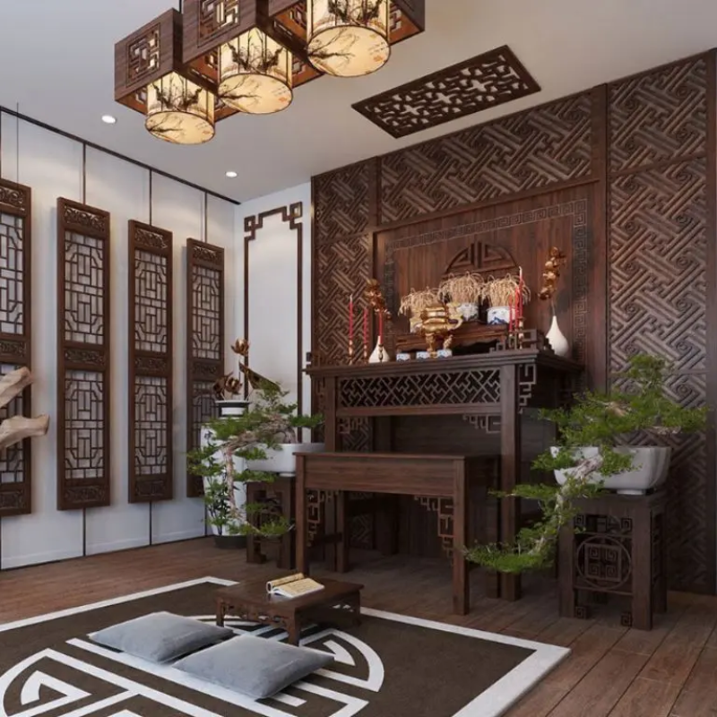 Ban thờ: Dùng ánh sáng vàng trầm, tạo sự trang nghiêm.
