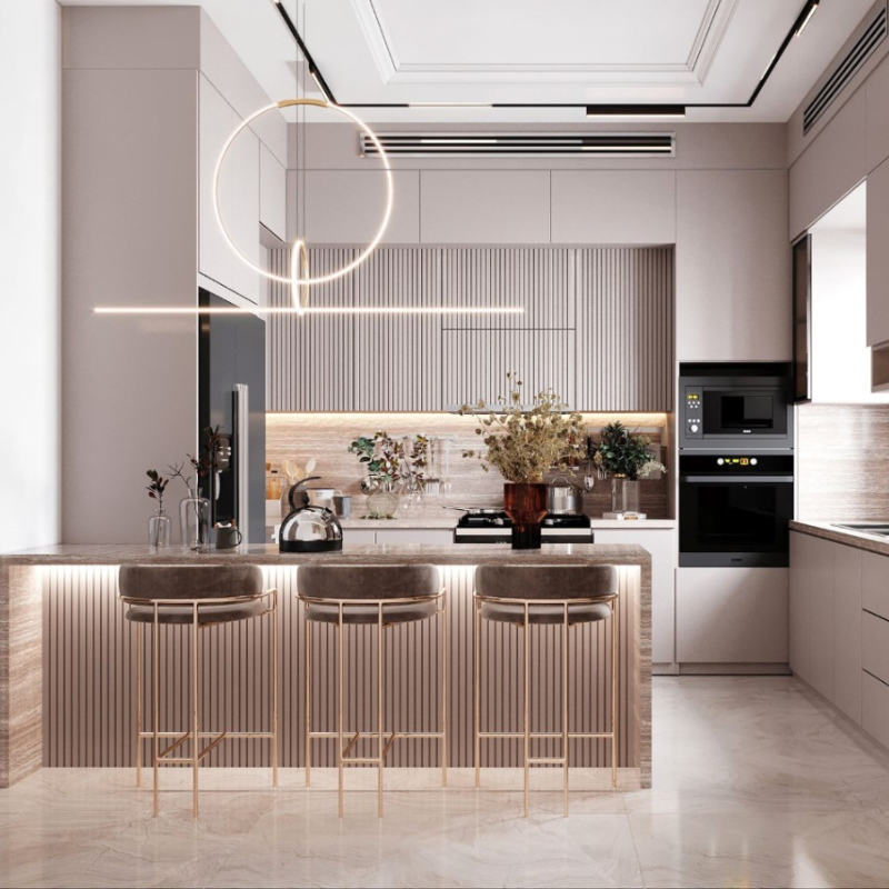 Phòng bếp và phòng ăn: Phòng bếp đại diện cho hỏa khí, là nơi “giữ lửa” của gia đình. Trong phong thủy, ánh sáng ấm áp mang tính dương sẽ giúp kích hoạt năng lượng Hỏa, thúc đẩy sự gắn kết, ấm cúng giữa các thành viên. Đèn trong bếp nên có sắc vàng hoặc cam nhẹ, tạo cảm giác dễ chịu và gần gũi. Đặc biệt, đèn treo giữa bàn ăn có ý nghĩa phong thủy quan trọng – biểu trưng cho “tụ khí sinh tài”. Ánh sáng tập trung ở giữa bàn thể hiện sự sung túc, ấm no, đồng thời giúp các thành viên cảm thấy thân mật hơn trong bữa cơm. Tuy nhiên, ánh sáng không nên quá chói, vì điều đó có thể gây áp lực hoặc mất tự nhiên khi dùng bữa.